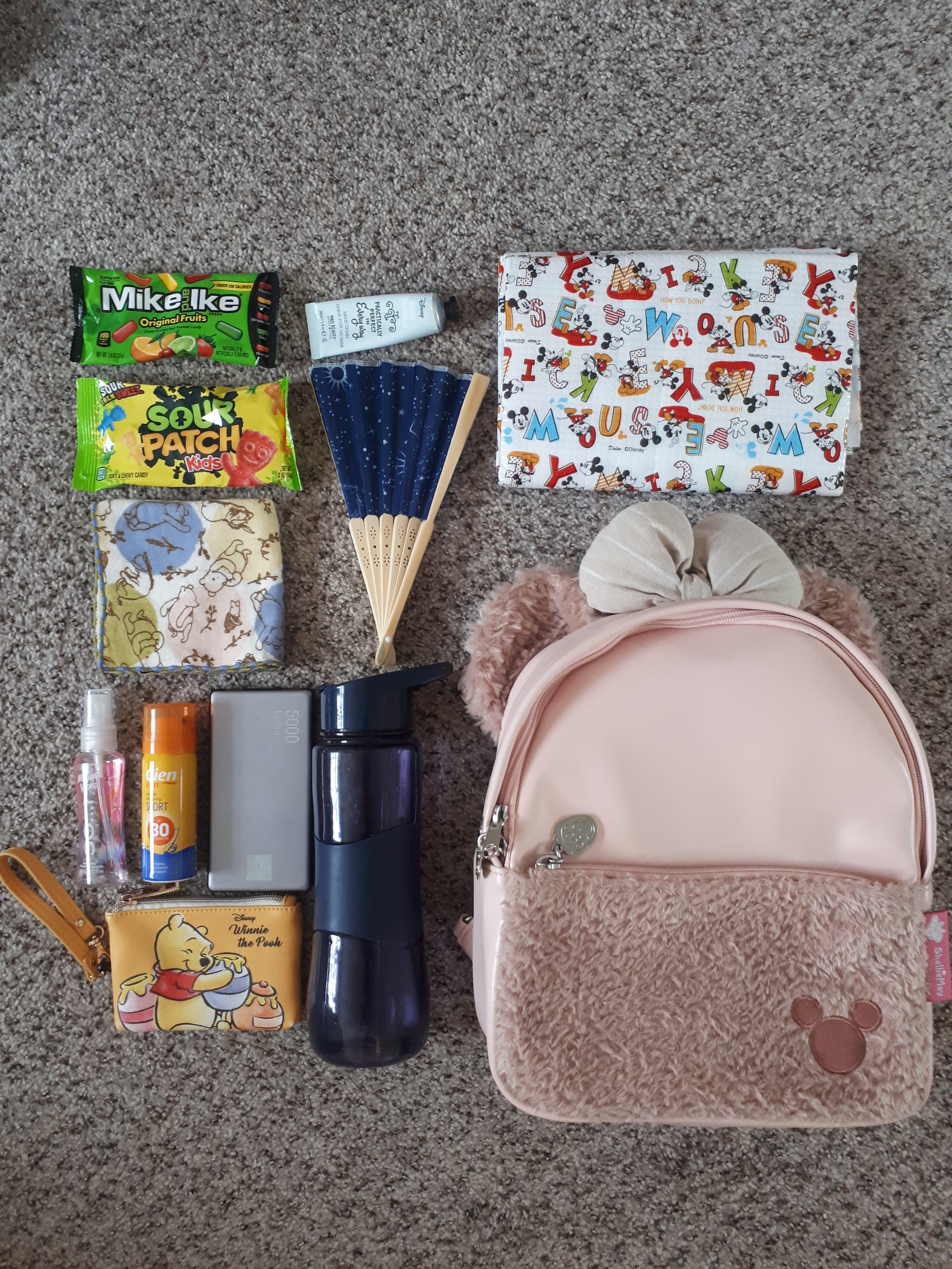 For my full day park bag, my bag size is just under A4. I carry in it a Mickey Mouse floor mat, a water bottle, fan, wallet, snacks, battery pack, sun cream, body mist, hand towel and hand cream.