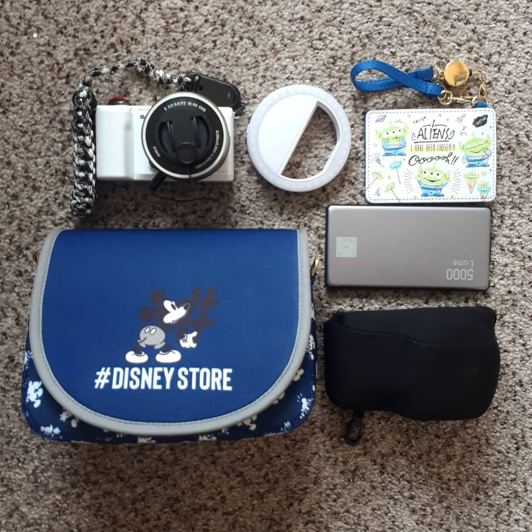 My photo park bag is for days I just want to take photos. I might jump on a ride or two, but mostly I want to take photos around the park. I’ll always have my camera and a cover, card wallet, battery pack and spare batteries, and a phone light in case of selfies.